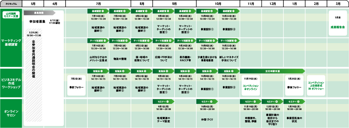 「マーケティング基礎講座」で学んだ内容をより深堀りするワークショップ。山村地域の方を主体として、専門家による支援の下、実際に事業計画を作成していきます。※「マーケティング基礎講座」の受講者が対象となります。