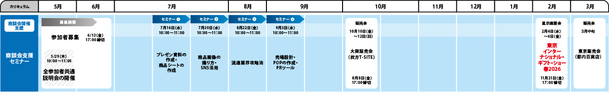 - ●年3回「山の恵みマルシェ」大阪と東京、2月「第101回 東京インターナショナル・ギフト・ショー春2026」)の「展示商談会」への出展を実りのあるものにすべく、展示会出展に向けて必要となる知識、資料の作成をフォローするセミナーを実施いたします。